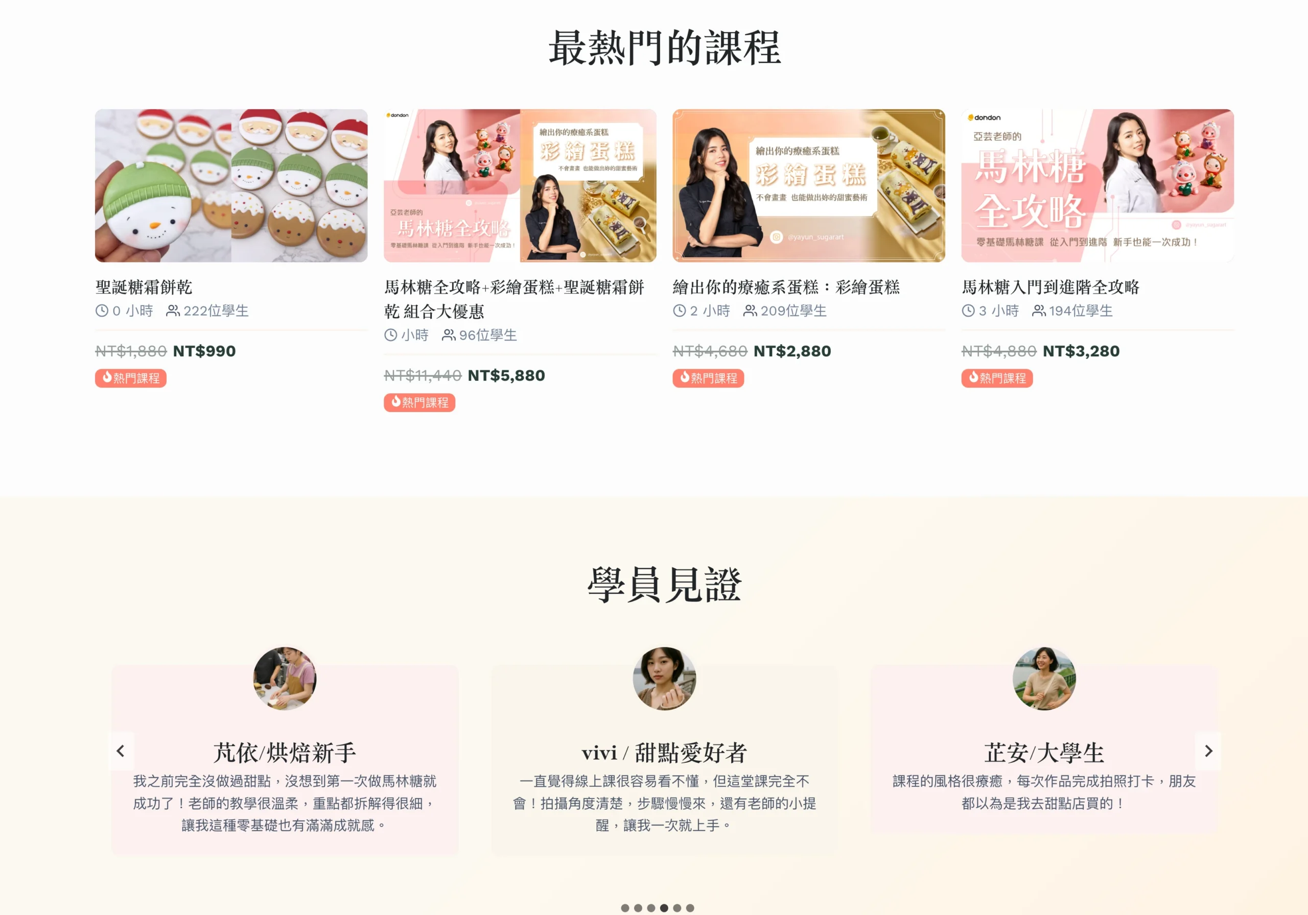 首頁以熱門課程作為入口,搭配學員見證建立信任,並以「立即註冊」收斂行動。