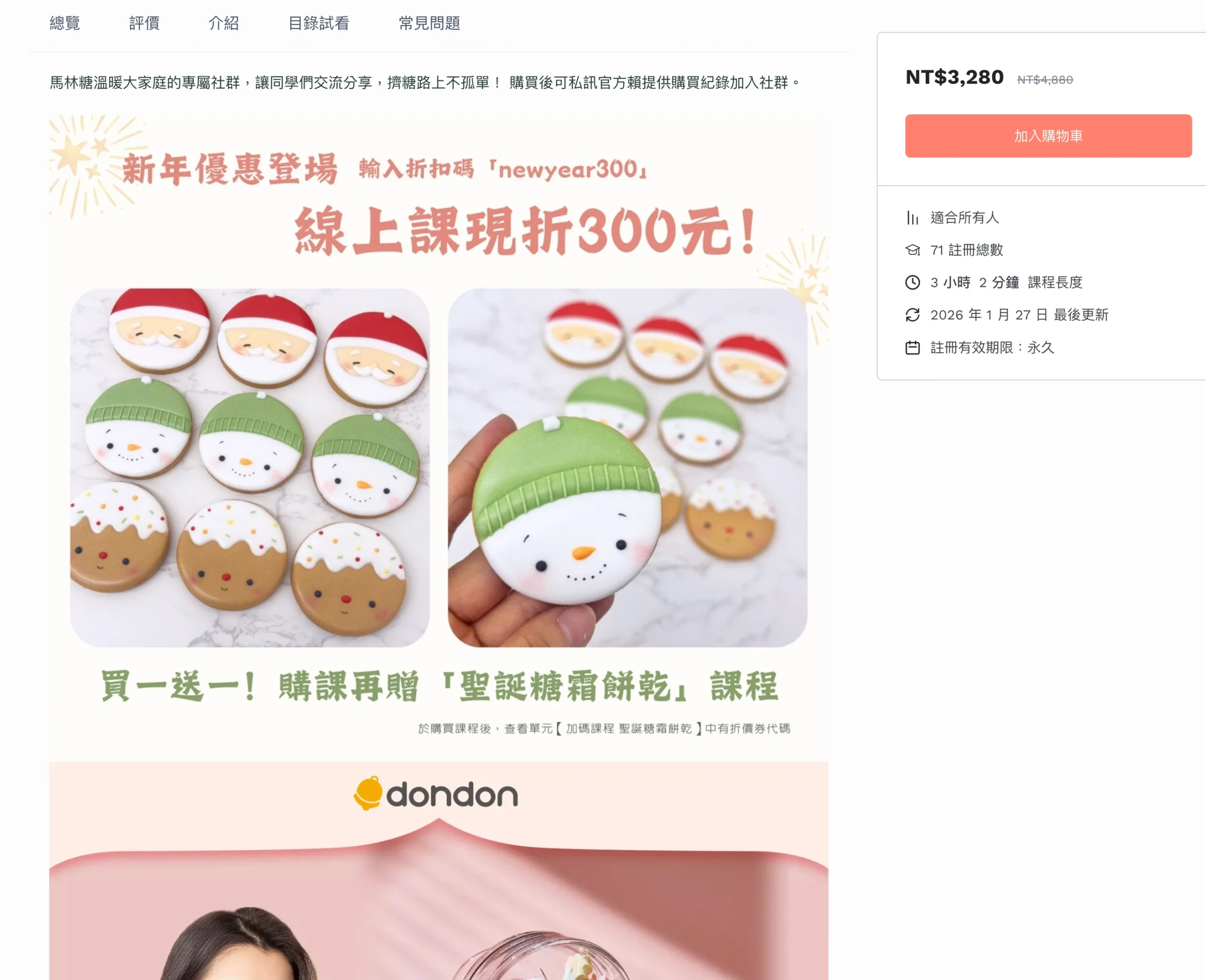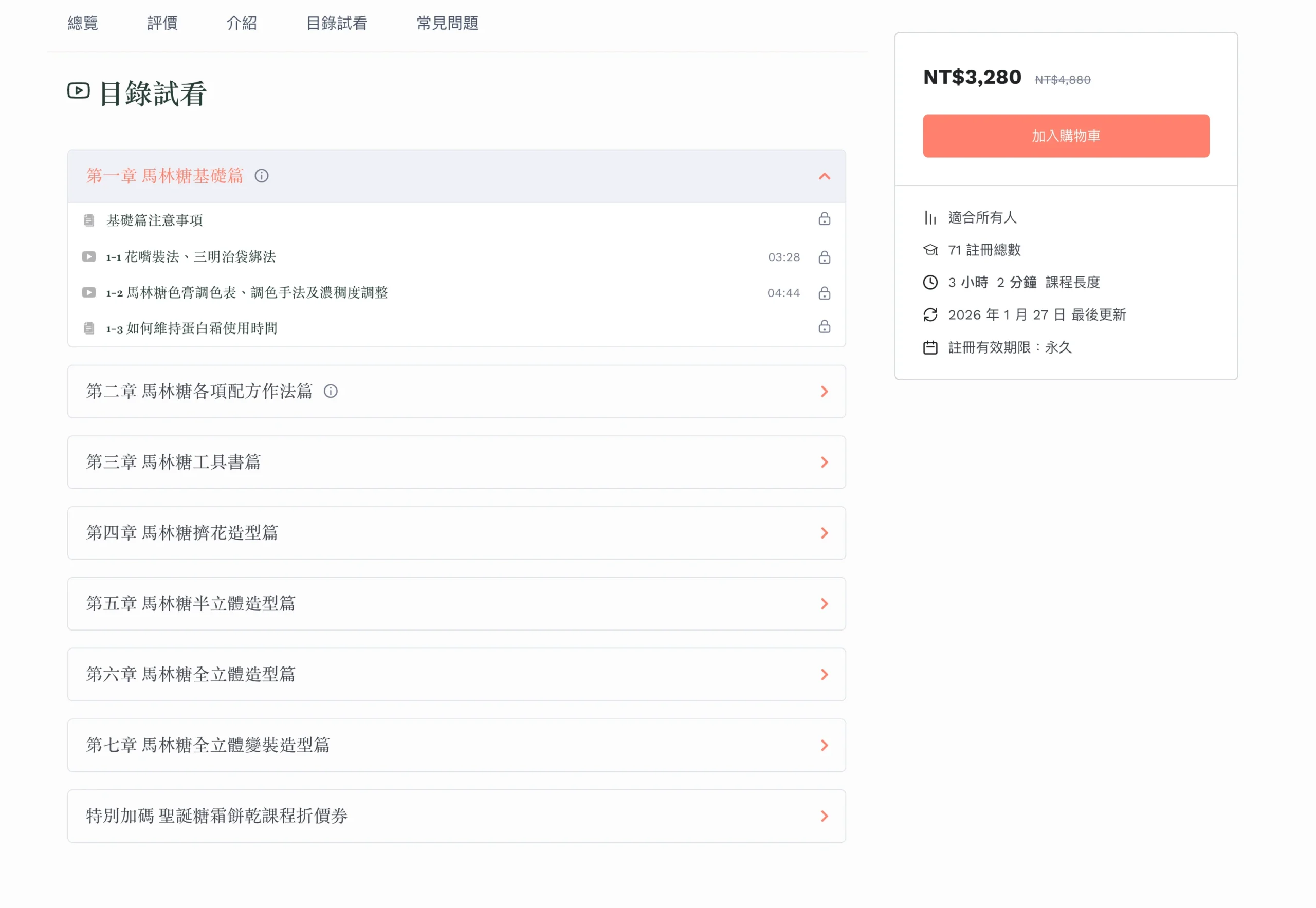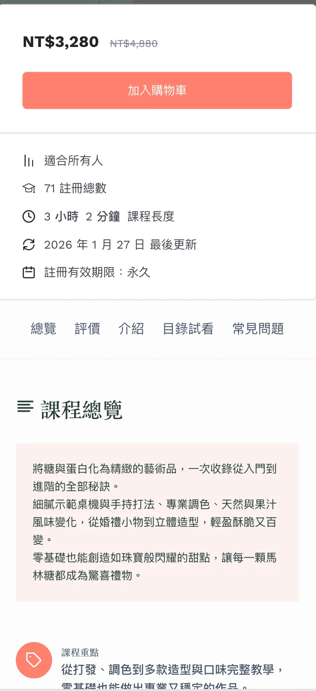 課程內容頁提供「關於課程 / 你會學到什麼 / 課程內容」等結構化資訊,讓使用者快速理解課程價值。