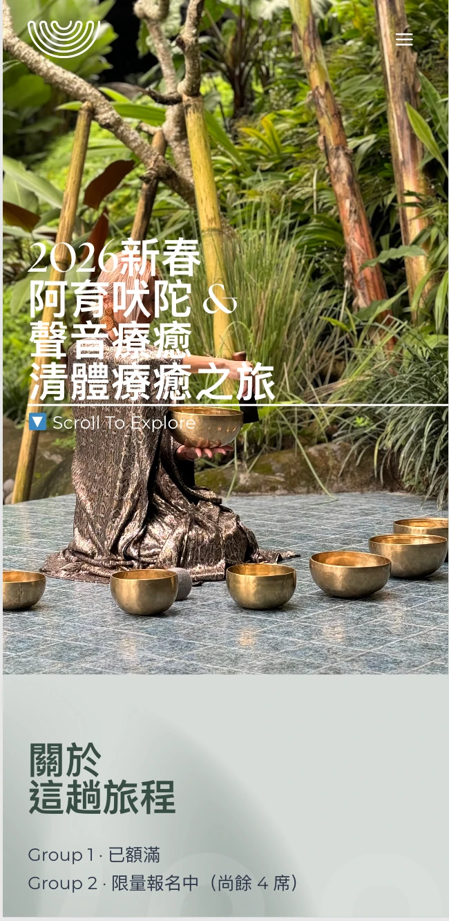 以峇里島為據點的高端旅修社群品牌,提供療癒旅程與專業培訓,需要一個能「承接轉換」的官網入口。