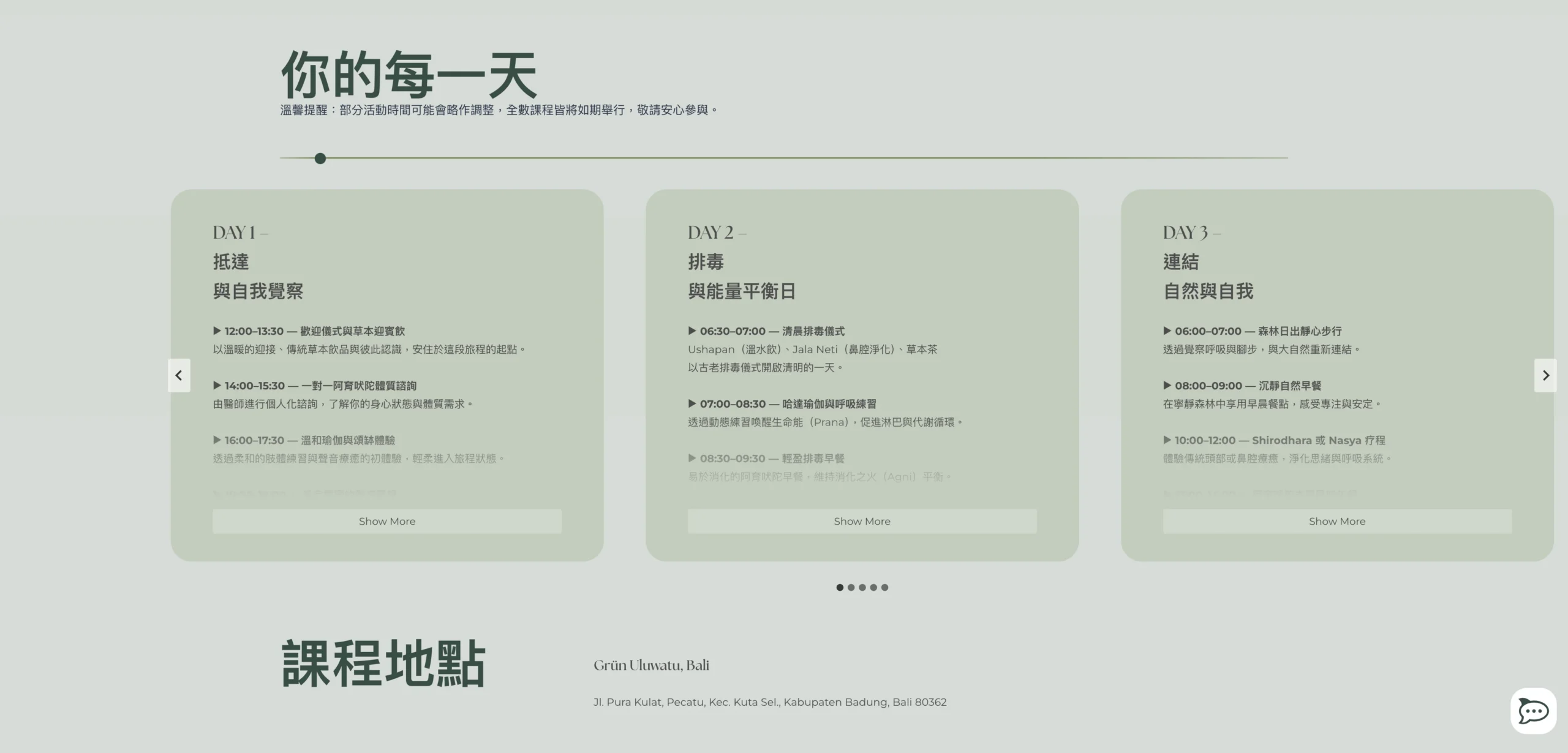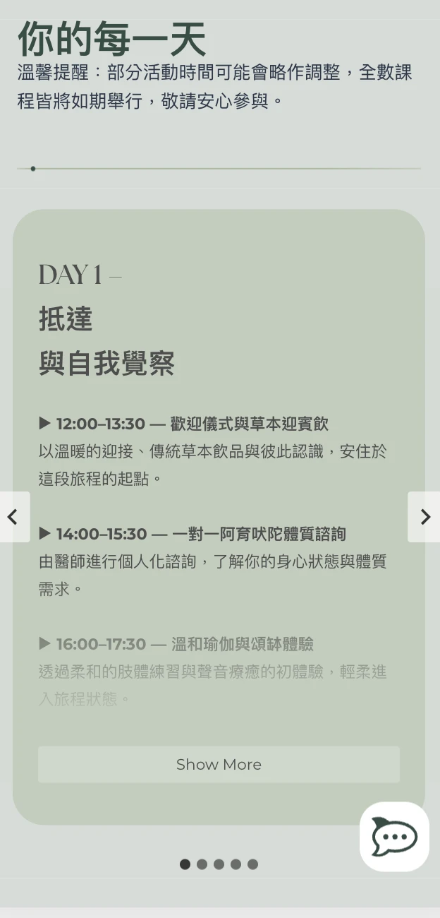 首頁節奏:以「品牌與理念(About/Philosophy)→ Retreats 檔期入口 → Trainings 入口 → 客製旅程(by request)→ Footer/聯絡」的節奏鋪陳;先讓人理解氛圍與價值,再提供明確的路徑進入檔期與培訓頁面做轉換。