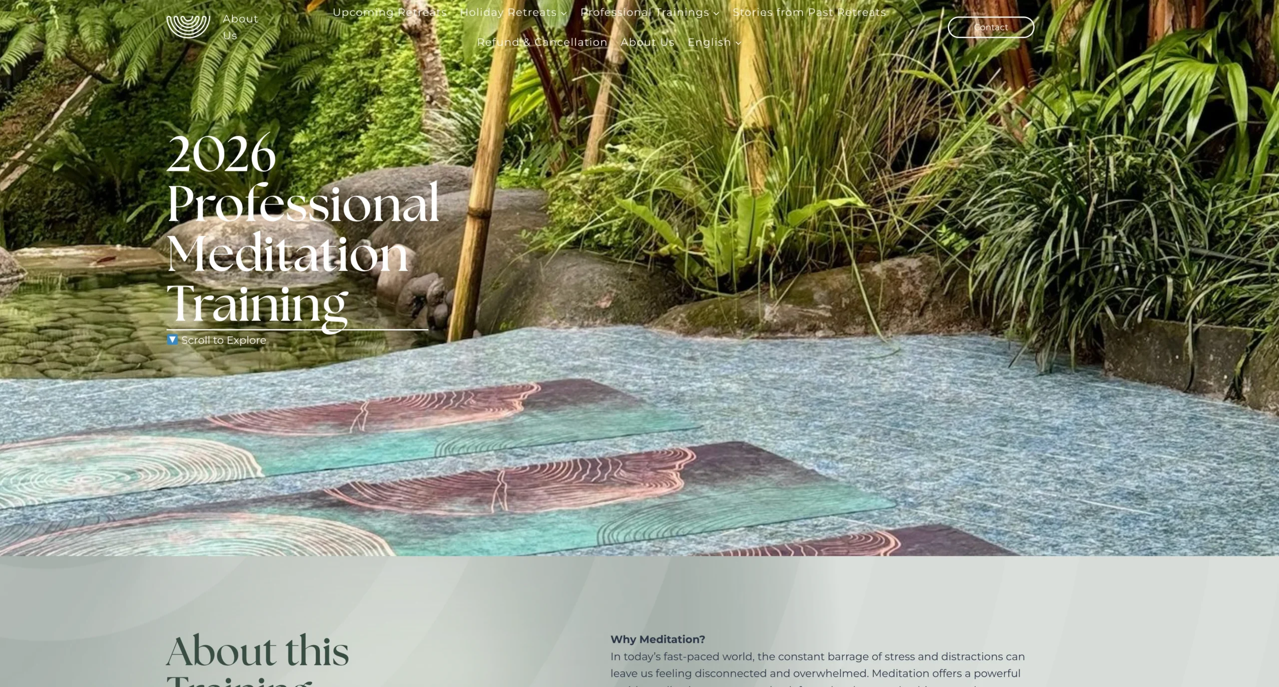 資訊架構重整:以主選單分層(About / Upcoming Retreats / Retreats & Trainings / Past Stories / Refund & Cancellation),讓首次來訪者先理解品牌,再快速進到可報名的活動清單。