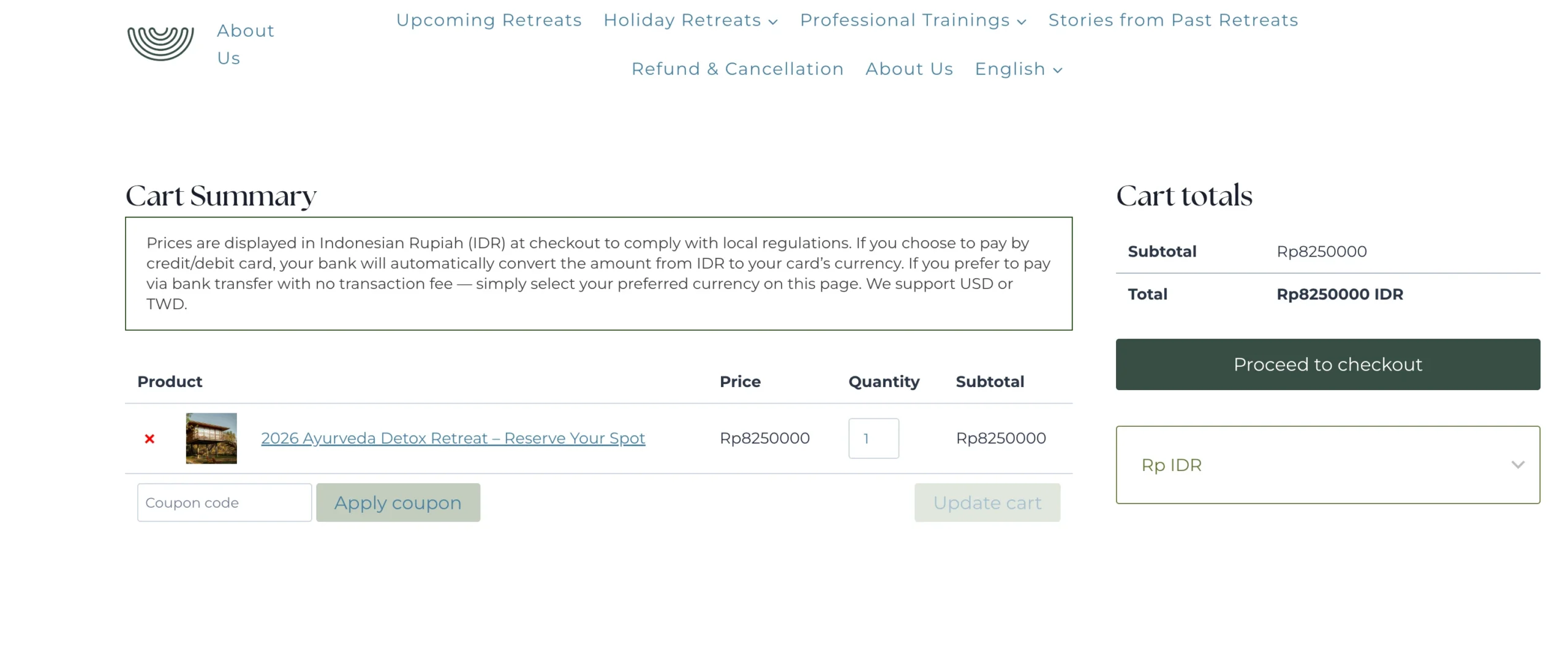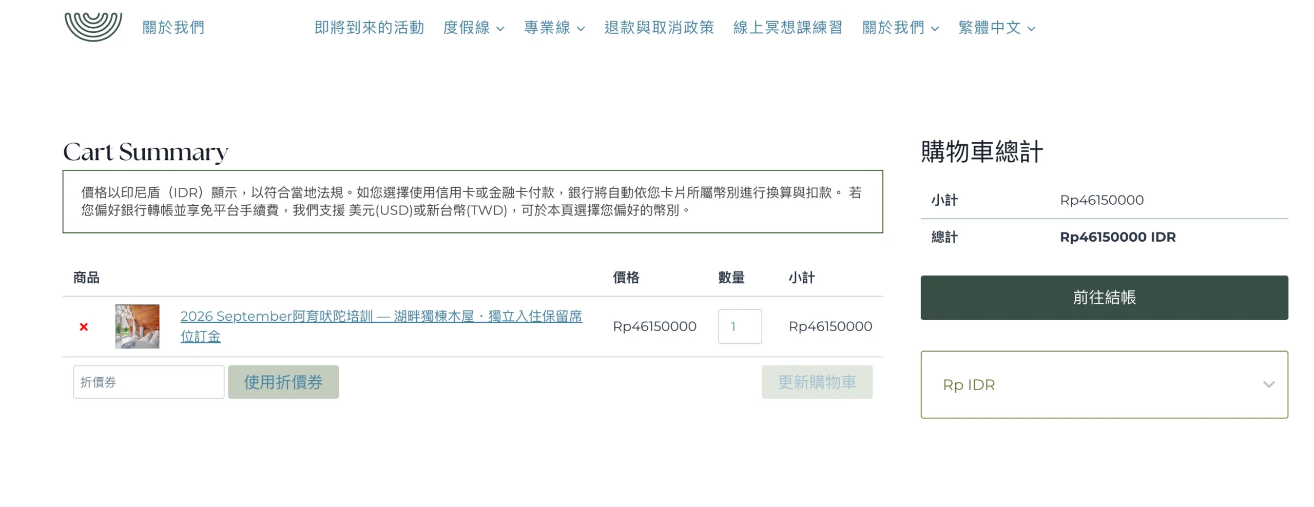 從 Upcoming Retreats 快速瀏覽 → 活動詳情 → 方案/價格 → CTA 導向購物車流程