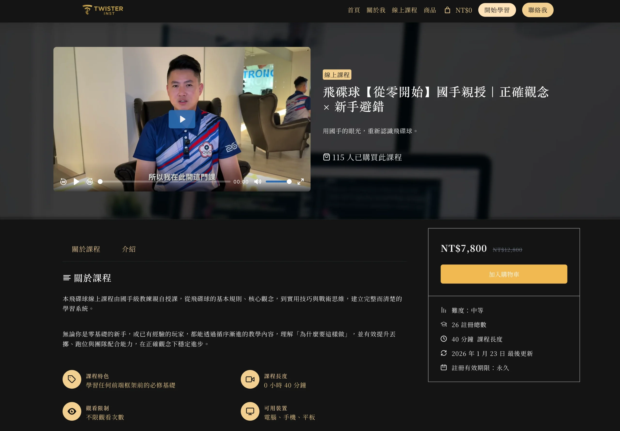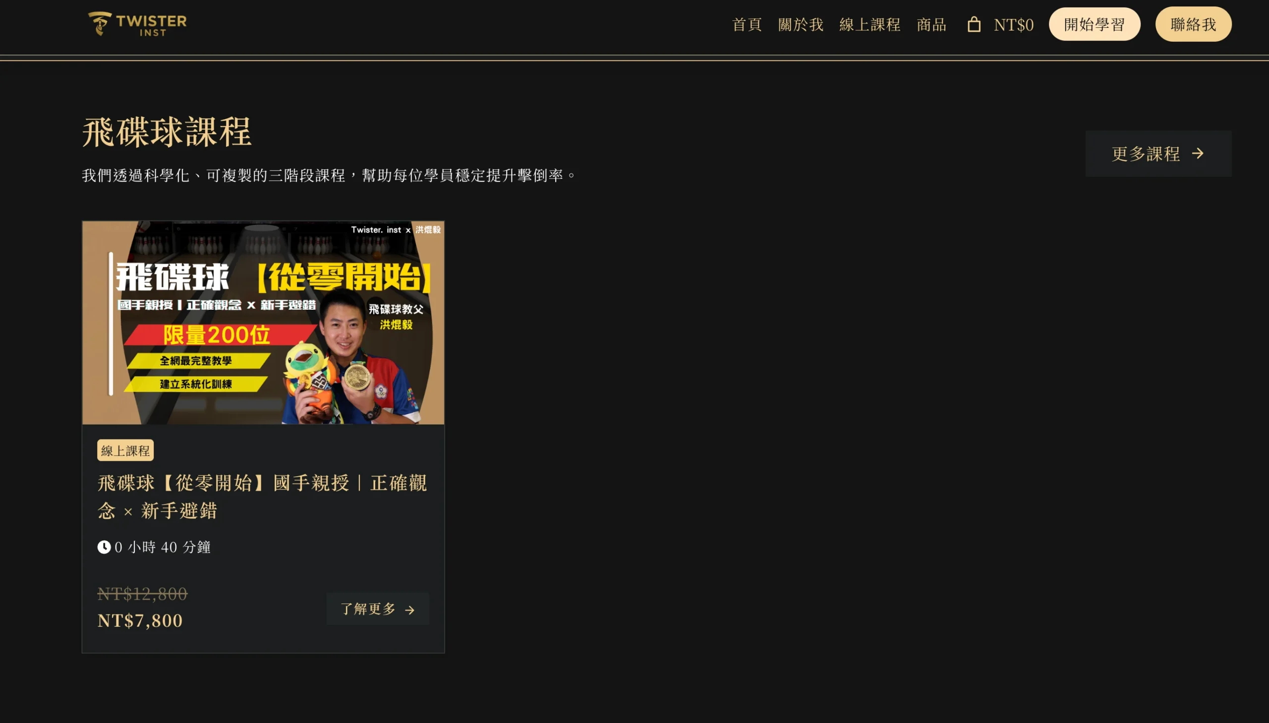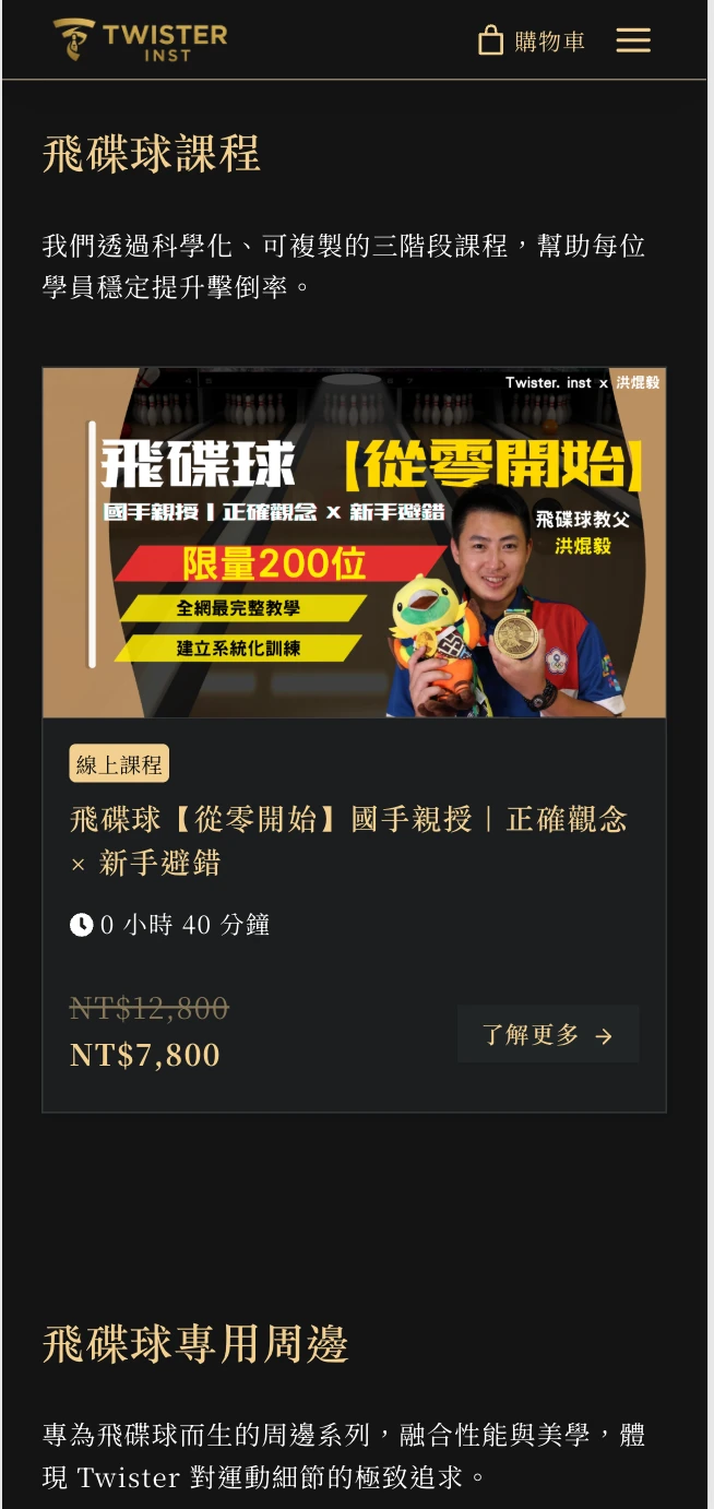 產品型態多元:線上課程(可直接購買)、飛碟球周邊、以及可視訊的 1v1 客製方案