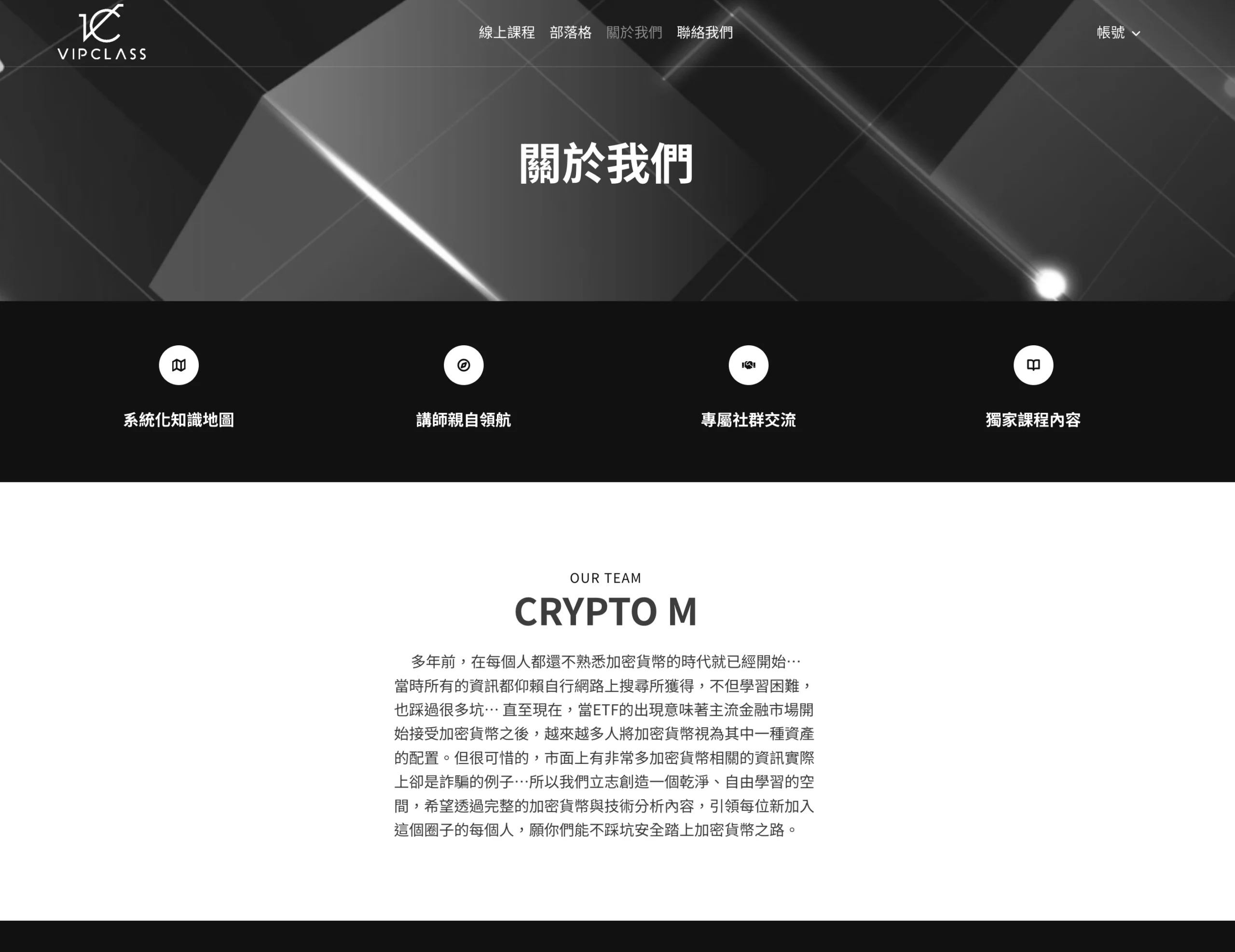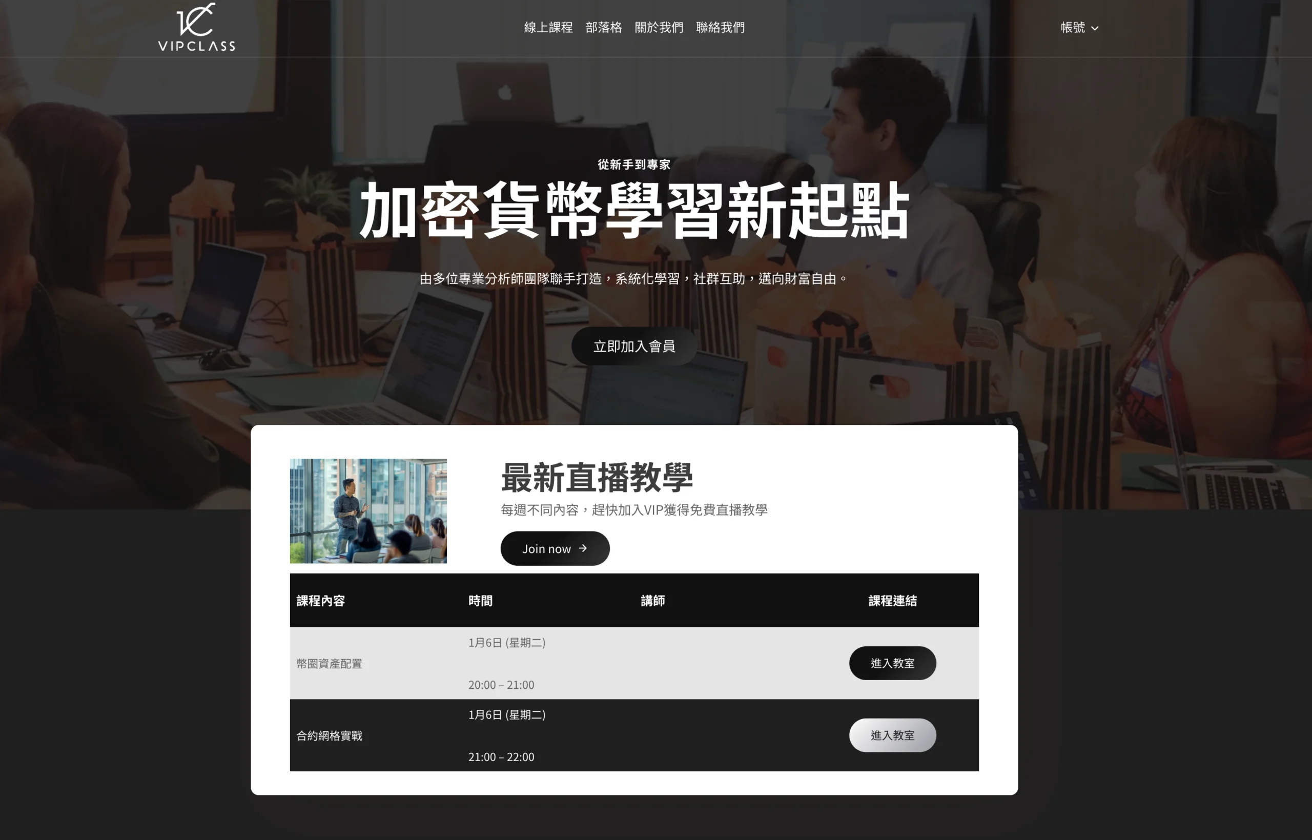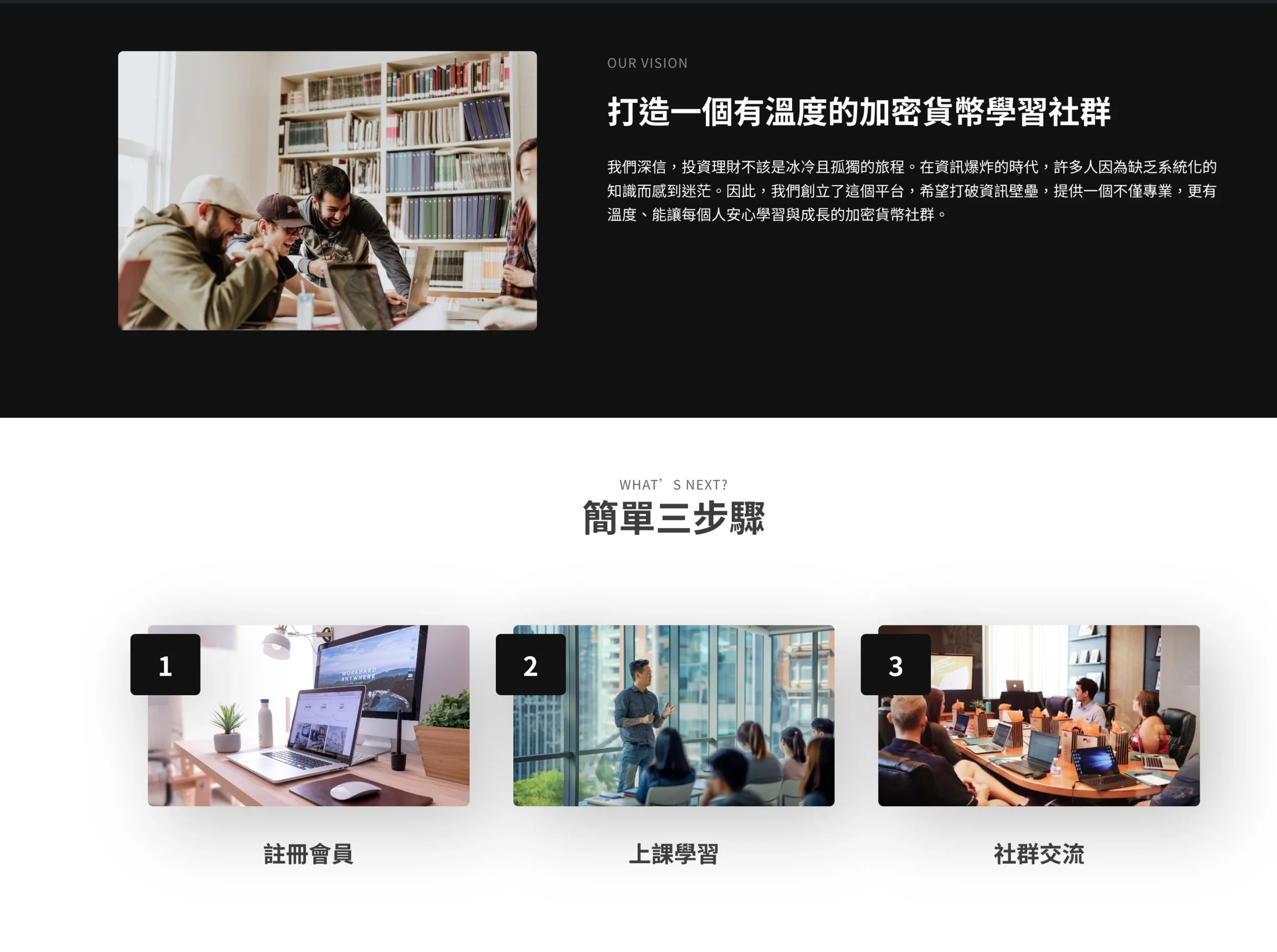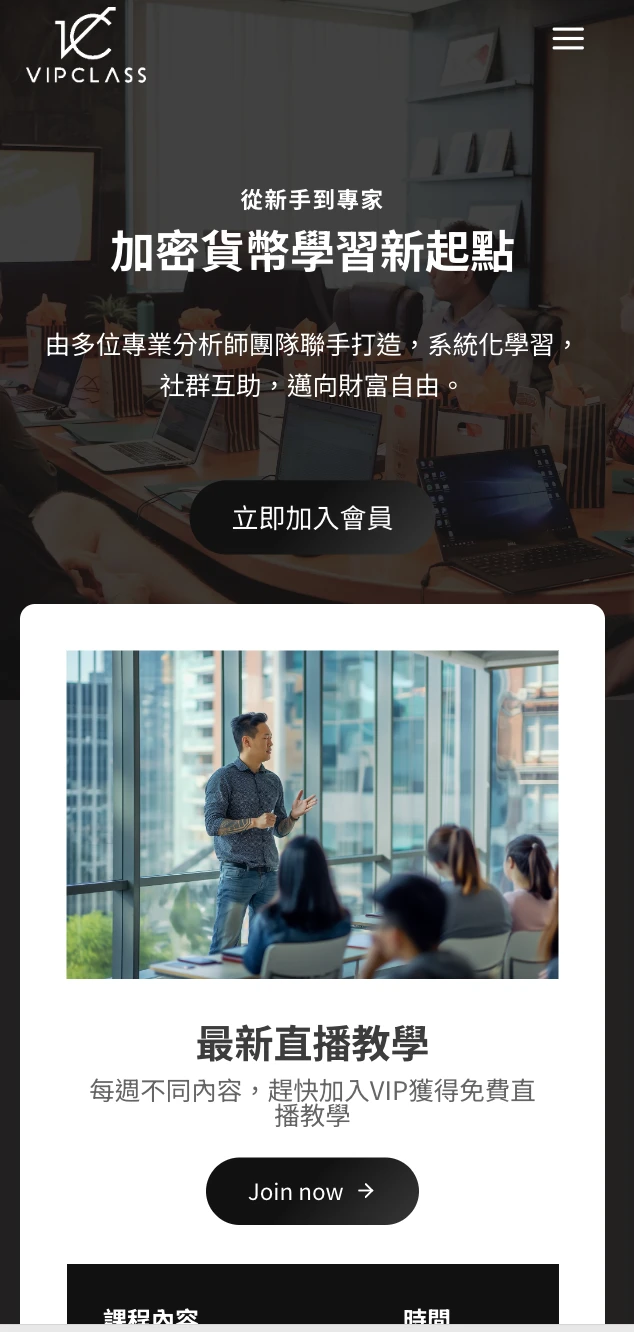 首頁節奏:用一句話價值主張(加密貨幣學習新起點)先定調,再用「立即加入會員」把動作收斂;接著帶出內容供給(直播教學/課程)與學習社群,最後導向會員旅程與學習步驟。